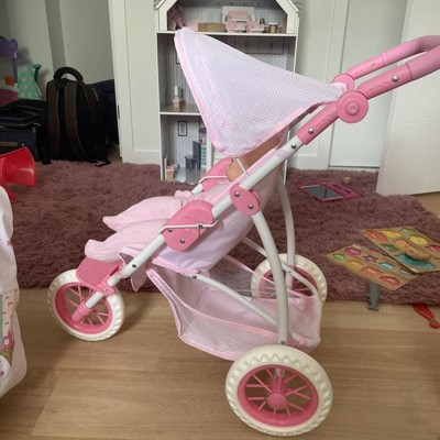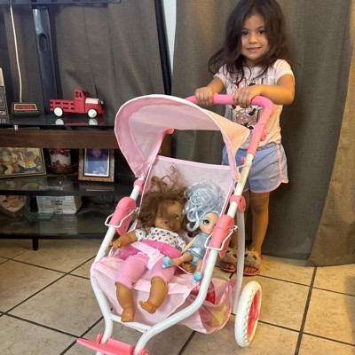 Pros: Bigger than most doll strollers with a sturdier frame. Will easily work for a 7-8 year old even. Cons: thin fabric. Shiney plastic tires that might crack and shred if used on pavement or sidewalks