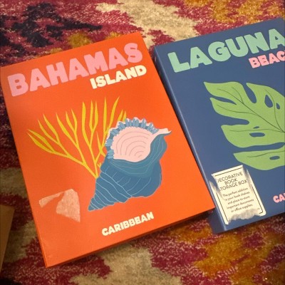 Great decor, looks so cute. However, I purchased 3 and they each came with a sticker on the front which were difficult to remove without damaging the cardboard. Can’t fathom why someone would put a sticker SHOWING ITS A STORAGE BOX ON THE FRONT of a faux cardboard book.