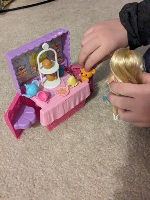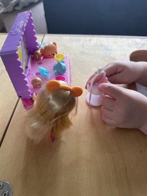 [This review was collected as part of a promotion.] This is a very cute little set with a Chelsea doll. The accessories are adorable my child specifically loves the little teddy bear with her. There was a bit of frustration trying to get the seats at the on and getting the headband off since it was secured to her head. My child came up with little tea party ideas invited other dolls to come play and in general it was used time and time again with imagination being at the center. the table folds in and closes which is nice to hold the food accessories. The holders for the party items are also super nice so that play doesn't get disrupted every time a sibling comes running past where the tea party is set up. And the fact that Chelsea can actually hold the cupcakes and other items made it extra enjoyable.