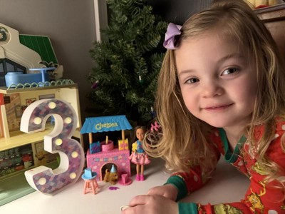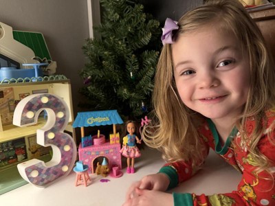 [This review was collected as part of a promotion.] Adorable Chelsea birthday playset that goes perfect with Chelsea playsets! The doll is so pretty and the puppy comes with a birthday hat too. The cake has a candle that can be removed as well. The overhead moves up and down for easy storage and doesn't take up much space. Perfect for a birthday present for a toddler and up since little pieces are included!