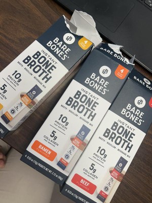 After trying a few leading brands the Bare Bones instant broths are the best tasting of the grass-fed beef bone broths, and has 10g protein and 5g collagen in each packet. 'Raman' is particularly tasty. Added carrots, onion, celery to make a delicious healthy soup.