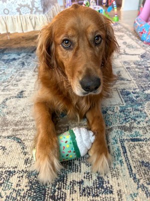 [This review was collected as part of a promotion.] Literally this is so stinking cute and my dog Maggie loves it! It has a great squeaker and it feels pretty durable for a dog toy. She hasn’t destroyed it yet, so that’s really saying something. It was a compatible size for a medium to large dog and just ridiculously cute! I love that it’s a play off of a Starbucks coffee.