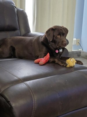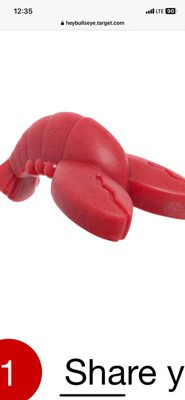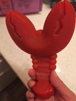 Our dog absolutely loves this red lobster chew toy. He plays with it at the end. And it holds up really well to his heavy chewing. It’s nylon and almost none of it is already gone. We’d buy one of these again, except for it, never disintegrates.