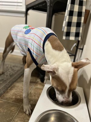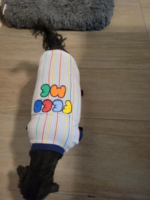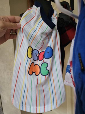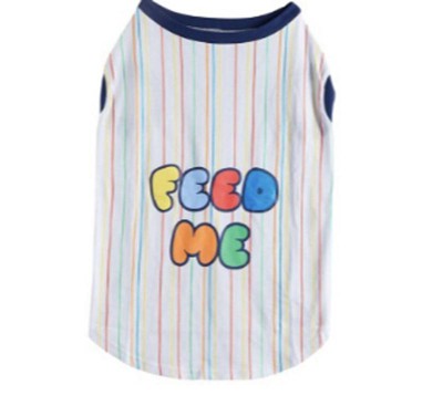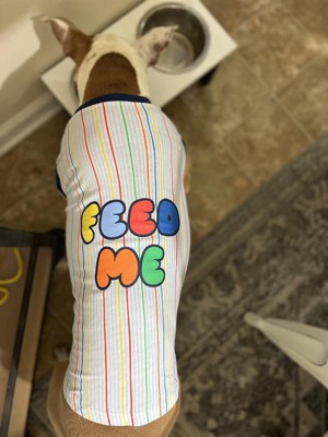 Super cute tee shirt for your little fur baby. I have a puppy french bulldog. Her normally wears a small but this shirt is a little big on him still. I cant wait for him to grow into it and wear it this summer. Vibrant colors. So true, he is always wanting fed lol