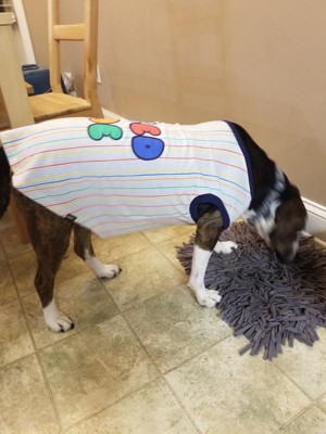 Super cute dog shirt that fits well. It was easy to get on my 50 pound hound mix, and easy to get off as well. It doesn't bind around her neck and legs like some other shirts, and it doesn't get in the way on walks and bathroom breaks.