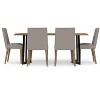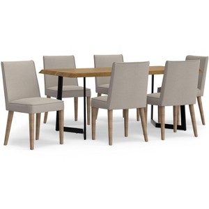 Elevate your dining space with the Navan-Hathaway Dining Set, a perfect fusion of contemporary style and industrial charm. The set features handcrafted Navan chairs, boasting sustainable rubberwood frames and soft woven fabric upholstery in versatile Taupe. Paired with the striking Hathaway table, crafted from solid mango wood with a light brown finish and distinctive metal legs, this ensemble seats six comfortably. The chairs' ergonomic design ensures lasting comfort, while the table's beveled edges and unique inverted leg structure add visual interest. Built for durability with a protective lacquer finish, this modern-rustic set combines functionality with aesthetic appeal, making it an ideal choice for both everyday meals and special gatherings.