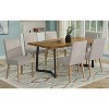 Table features a light brown finish and charcoal metal legs, while chairs are upholstered in soft taupe woven fabric.