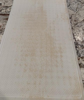 This mat is soft. It has many suction cups that hold it firmly in place, helping to provide a nonslip surface. It was delivered February 2, 2023 and today is February 16, 2023. It has been used approximately 10 times. Following the care instructions, we have wiped it off after using it and pulled it off the tub floor, hanging it to drip dry. It has become yellowed, causing us to wonder if it is growing mold. We have city water and a water softener, so our water doesn’t have rust or heavy mineral content. See the attached pictures. Don’t buy.