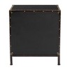 Lend a touch of industrial-style flair to your space with the stunning Laura end table. Tactfully crafted in China, this vintage inspired piece consists of a sturdy wood frame wrapped in smooth canvas. Metal-plated edges and studded embellishments highlight the robust nature of the piece while two drawers offer convenient storage for a variety of household essentials. The Laura will arrive fully assembled and utilizes minimalist metal base with rounded legs for excellent stability and support. Beautifully shaped leather strips complete the look, making the Laura end table an enthralling addition to any space. Overall: 23.60" W x 18.10" D x 26.60" H; Drawer(s): 19.90" W x 13.40" D x 5.90" H; Clearance(floor to bottom of cabinet): 4.90"H;