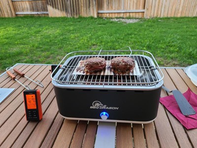 [This review was collected as part of a promotion.] The BBQ Dragon Zephyr Grill is a great charcoal grill. It is compact and portable yet large enough for plenty of food. The battery operated fan makes for hot coals with not so many needed; this means less coal waste and more cooking! I also like the light up fan control knob which makes it easy to see in the dark. Overall the grill cooks well and the removable grate makes for easy cleanup.