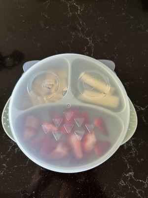 [This review was collected as part of a promotion.] I ordered this plate because my one-year-old granddaughter is coming for a visit next week. I tried it out on her highchair tray and, with four section cups, it has really strong suction! Trust me, this plate is not going anywhere! At first, I thought taking it off might be problematic, especially was if there was any food left on it, but now I see that there are little tabs on the side of the four section cups that can be used to lift it off. Though, I will add that if you set it down anywhere with a smooth surface, like on the counter or on a refrigerator shelf, it will stick immediately so I will need to be careful about that. I had to maneuver the sides of the plate just a little bit to get the lid on, but that's OK because once on, it is nice and snug (which is not the case with another similar silicon product). I'm very happy with this toddler plate, it's exactly what I needed.