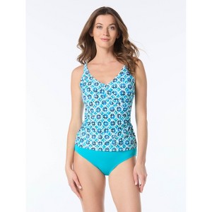 For a figure flattering and fashionable swim style, try this silhouette. This fitted tankini hugs the body while giving support with underwire and high style with a v-neck, wrap neckline. Splashed with a fun geometric print, inspired by the intricate details and bold colors of Hawaiian architecture.