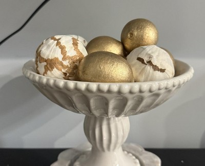 This beaded ceramic bowl has a very classic design to it. It is basic yet beautiful. You can use this for fruit on a table on your countertop or even in another part of your home with decorations on it. The bowl part is a little smaller then I had thought yet works well for what I need. I would recommend adding to your home decor.