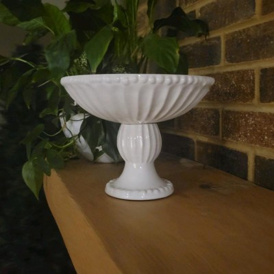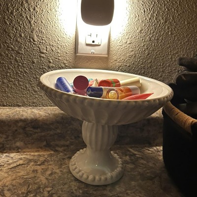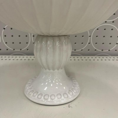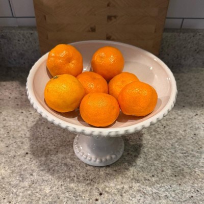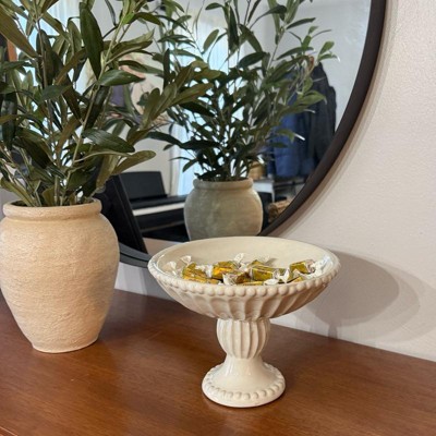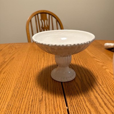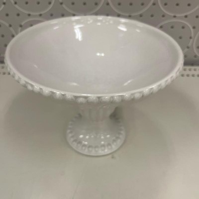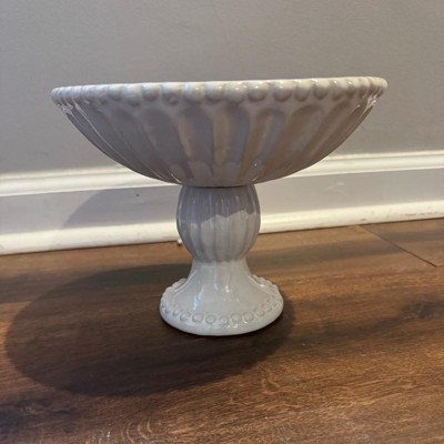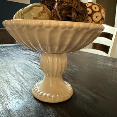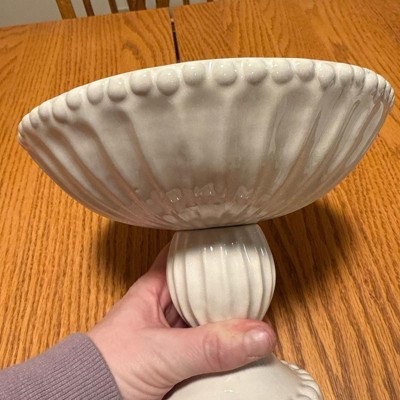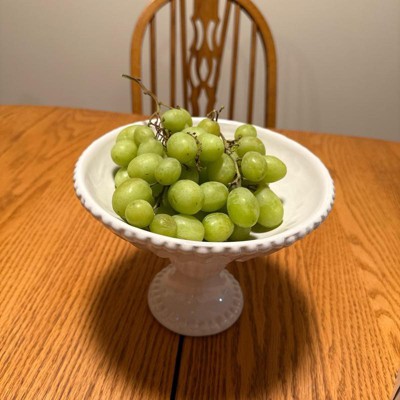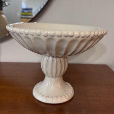 Very pretty pedestal bowl! Looks more expensive. I love that it is ivory and not white as there is very little available in ivory. Will look great filled with fruit in my kitchen. Not so large that it takes up a lot of space. Will also look nice along side some of the matching pieces