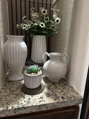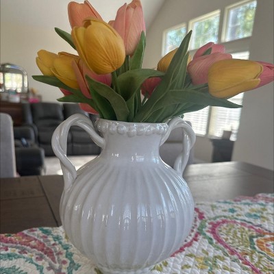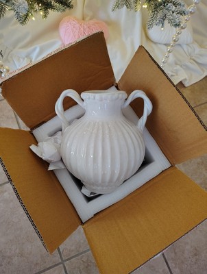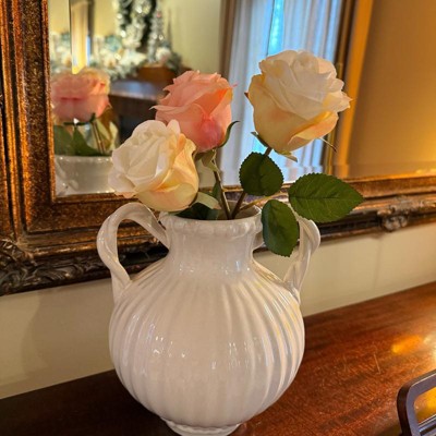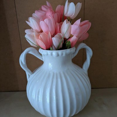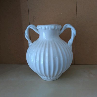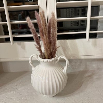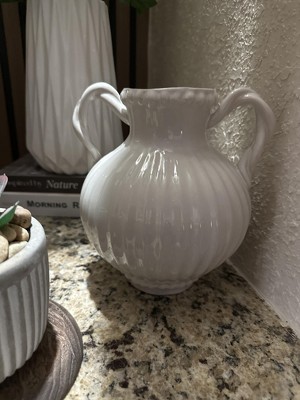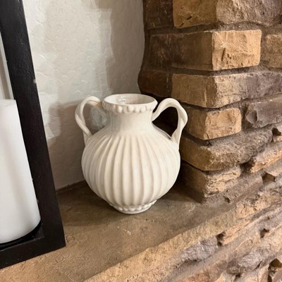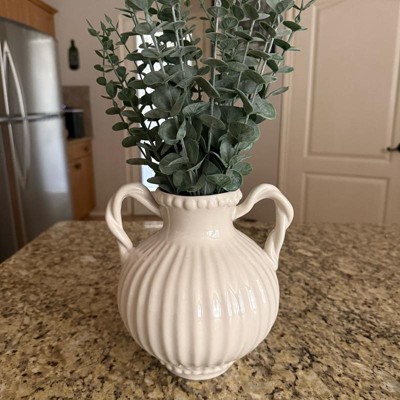 [This review was collected as part of a promotion.] This Threshold ivory beaded ceramic vase is pretty enough to use on its own or with artificial or real flowers since it is watertight. It would work well with lots of decor styles since it is a timeless design, with a ribbed pattern, 2 handles and beading details. It was delivered well-packaged and measures 8.5 inches high and 7 inches across.