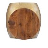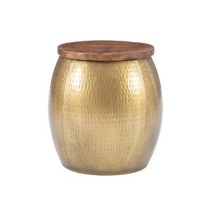 Add a touch of elegance to your home with this hammered metal storage drum. Handcrafted in India, the muted brass finish of the metal body and rich texture of the solid wood lid create a rustic, eye catching contrast. The lid lifts off to reveal hidden storage, perfect for extra blankets, pillows, or rogue remote controls. Measuring 19” from the ground, this versatile accent piece doubles as a small table and subtle storage that fits wonderfully next to a couch or set of chairs.