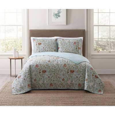 Classic floral scroll print with a blue base on a 100% cotton fabric. The tan vines have flowers of rusty reds and soft purple. The comforter reverses to a solid light blue color in 100% brushed microfiber polyester for easy coordinating. The comforter is filled with 100% polyester fiber fill and the reverse cloth is a brushed 100% microfiber polyester. Each comforter set comes with a comforter and sham(s). Comforter face is 100% cotton with 100% microfiber reverse cloth and filled with 100% polyester fiber filling. This item is machine washable; however, please make sure equipment is large enough to allow the item to move freely in wash. The item is manufactured in China. Set includes: comforter 68x90 inches and one sham 20x26 inches.