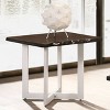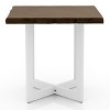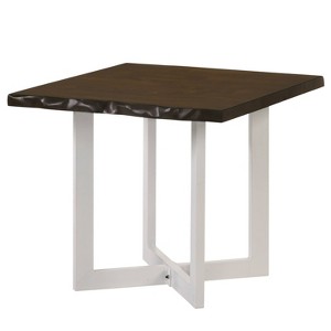 Chart a modern decor course that's inviting and eye-catching with this transitional end table. It shows off a crisp look that works in a wide range of space and has a spacious live edge style tabletop in a rich dark oak wood finish. The generous tabletop rests on a contrasting white finish metal base with a crossed design that adds detail without being fussy.