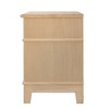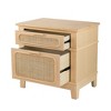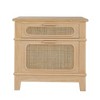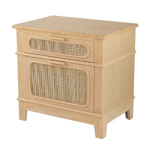 - The product offers a light pine wood veener as well as caning inset on the drawers for a bohemian feel with a mid-century flair.