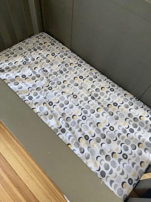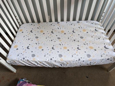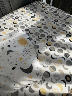 Sleep soundly knowing your baby is resting on our ultra-soft, microfiber crib/toddler sheets. Bedtime Originals sheets are the perfect choice for your little one’s delicate skin. This white and gray celestial two-piece sheet set features crescent moons, suns, stars, and planets. The second sheet has all the many phases of the moon. There is elastic all the way around ensuring a safe and secure fit on a standard size crib mattress measuring 28” X 52”.