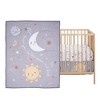 Bedtime Originals Little Star three-piece baby bedding set will create a nursery that’s truly out of this world. The three-piece set includes one quilt, one fitted crib sheet and one crib skirt. The quilt has an expertly appliqued crescent moon in soft white faux shearling with an adorable embroidered face. The words “love you to the moon and back” are printed next to the moon. There is a sweet yellow sun, a happy blue planet and shooting stars. This quilt is the perfect size for tummy time with your little one. The microfiber fitted crib sheet is on a clean white background with crescent moons, suns, planets, and stars. There is elastic all the way around ensuring a safe and secure fit on a standard size crib mattress measuring 28” X 52”. The crib skirt adds a designer touch to your child’s crib. The crib skirt features happy white crescent moons, cute yellow suns, and multi-colored stars. This celestial design will ignite your baby’s imagination, with a sense of wonder and curiosity. The microfiber material and soothing colors promote a calming environment that encourages a peaceful sleep for your little one.
