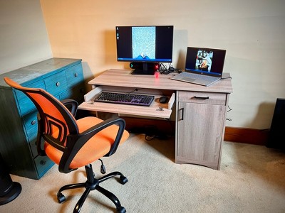 Super excited to use this desk. It is easy to put together. I love the color of the desk. I am excited that it has a keyboard drawer and another drawer on top. It also has a big cabinet door as well to hide all of the odds and ends.