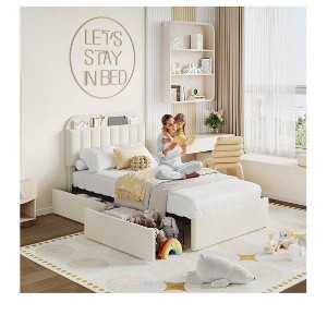 - [Functional Headboard]Stay organized with the innovative storage headboard featuring vertical space for books and personal items. The full bed frame with soft padded design provides comfortable support for lounging, making it easy to enjoy your favorite reads or relax.[Flexible Drawers]This modern kids bed frame features 2 rolling storage drawers that can be placed on either side to meet your needs. Perfect for storing extra bedding or personal belongings, these drawers keep your space clutter-free and tidy.[Luxurious Upholstery]Enjoy cozy sleep with the soft, warm teddy velvet upholstery of this full size platform bed frame. Its luxurious texture boosts comfort and adds a stylish touch to your bedroom decor, making every night a delightful retreat.[Sturdy and Noise-Free]Constructed with a heavy-duty metal frame and sturdy wooden slats, this noise-free bed frame offers the stability needed for a restful night's sleep, with a load capacity of 950LBs. Enjoy peace and quiet without requiring a box spring.[Simple Assembly]With a modern finish and vertical channel pattern, this upholstered bed frame complements any bedroom decor effortlessly. Clear instructions and labeled parts make assembly straightforward, allowing you to enjoy your new bed quickly.