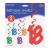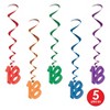 Choose your milestone birthday whirl. These whirls come in assorted colors of red, orange, green, blue, and purple. Each hanging whirl measures 36 inches long. They are made of metallic plastic.