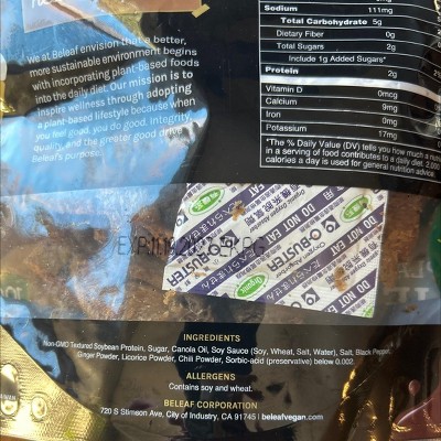 Super Sugary. The product does not show ingredients in the Target website. Does contain gluten. The main taste is sugar and pepper. Does not taste like jerky!