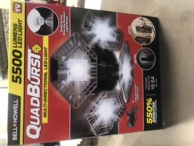 [This review was collected as part of a promotion.] I really like my new Bell and Howell QuadBurst LED light! The light has four sections that can be angled in any direction and has a light bulb type base that can be screwed into any traditional light socket. The 192 high intensity LED bulbs only draw 80 watts yet provide 5500 lumens of bright white light which completely illuminates my entire garage. This should offer a big savings over my existing fluorescent fixtures. The four adjustable sections allowed me to shine the light right where it was needed. I do wish that the light came with the option of a power cord so that it could be plugged into a standard outlet, but it works fine when screwed into a sturdy ceiling socket. I would recommend this product.