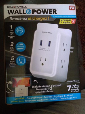 [This review was collected as part of a promotion.] This wall power works great when you need to plug multiple things up at one time. I recommend this wall power. It has 5 power outlets and 2 usb ports. In total you can plug 7 items up at one time and it does not get overheated like most power walls when plugging multiple items up. It works great. Bell + Howell did great when making this. I am pleased and so is my family. I bring this with me and my wife when we are traveling for work since I am an truck driver.