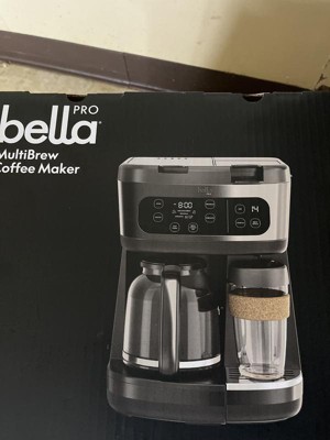 A: Not sure why Bella Customer Service says it does not come with a coffee pot. It does come with a coffee pot. It's in the description and the specifications on this page. It's a 12 cup glass carafe.