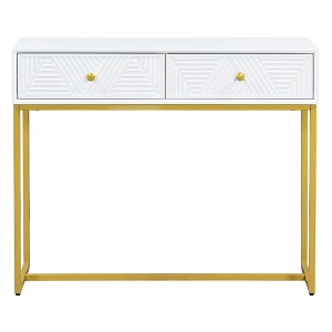 Enhance your living space with the Modern Sleek Console Table, a chic and sophisticated addition to any room. Its elegant design features a striking black tabletop paired with a bold gold metal base, creating an eye-catching focal point in your home. Crafted from durable MDF, this console table is not only stylish but also practical, with two spacious drawers showcasing a unique diagonal stripe pattern for added artistry. Whether you're looking to organize your entryway or elevate your decor, this console table offers both functionality and modern flair. Available in four versatile colors, you can choose the perfect match for your interior. Bring a touch of contemporary elegance to your space with this exquisite piece.