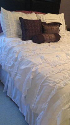 This comforter looks so pretty on the bed but the ruffles are so scratchy and itchy that if you ever plan on sitting on top of your bed then this won’t work at all. The edges of the ruffles have been coated/heated to prevent fraying, making them extremely scratchy. Unfortunately this didn’t work for us since we sit on top of our bed frequently. Other than that, the comforter is very plush, full, and heavy. Seems very warm and perfect for winter. The ivory is also a beautiful color and not too yellow- just perfect.