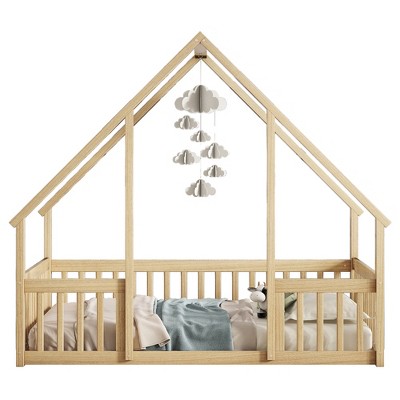 Bellemave Full Size Montessori Floor Bed, Wood House Bed Frame, House Bed for Kids, Montessori Bed with Fence, Playhouse for Kids,Natural