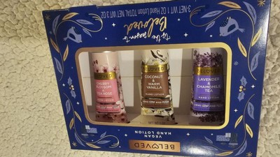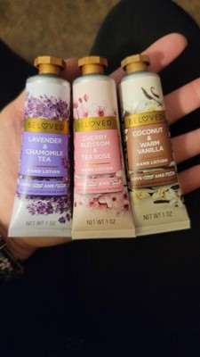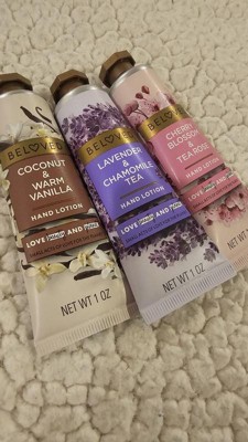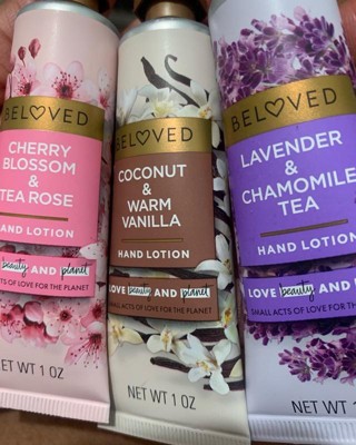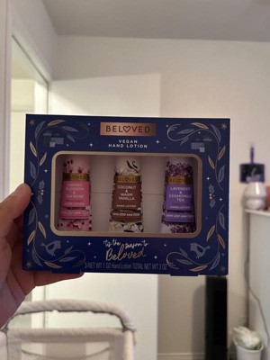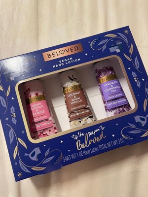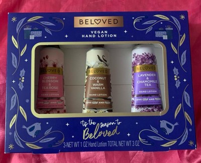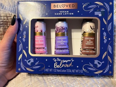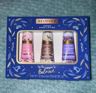 [This review was collected as part of a promotion.] The cherry blossom & tea rose vegan lotion by Beloved impresses with its sweet, delicate aroma. Its handheld size is perfect for daily convenience. Amongst the trio, it's currently my top pick. The rich lotions require thorough rubbing to absorb fully, initially showing a white residue. It effectively prevents dryness or ashiness because I scratched to test it. Conversely, the Lavender Chamomile's strong chamomile flavor may prompt me to give it away to someone as a gift! , it is my least favorite. Meanwhile, the Coconut Warm Vanilla offers a unique, sweet warmth, much like hot cocoa, setting it apart from typical vanilla scents. I would recommend this set to anyone who works in a job where they have to wash their hands alot! I also recommend this as a great stocking stuffer for Christmas which is right around the corner The ingredients as vegan as suggested look pretty hard to easily pronounce ... idk how true this is 🤔 but I don't care about whether it's vegan or not so I'm not mad about it! Packaging is cute add a bow and it needs no wrapping !