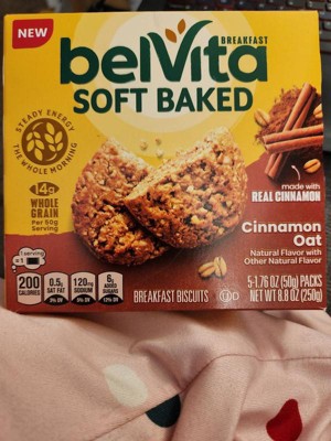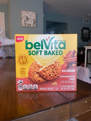 - One box with 5 packs, 1 biscuit per pack, of belVita Soft Baked Cinnamon Oat Breakfast Biscuits