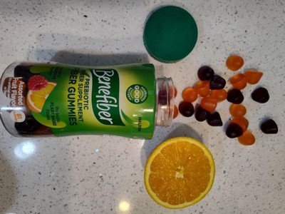 These assorted fruit prebiotic supplements are made with natural fruit flavors, supporting your digestive health with prebiotics that are convenient, easy to take on the go and great tasting (1). For ages 12 and above, chew 3 gummies up to twice daily. Do not exceed 6 gummies per day. Ages 6 and under ask your doctor. Benefiber makes taking fiber easy.