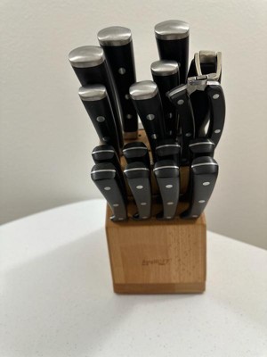[This review was collected as part of a promotion.] It’s an interesting knife set and it certainly has a lot of items included. I love the selection of knives, as well as the cutting board and herb mincer. All knives feel very durable. As far as the lazy Susan swivel underneath the block I’m honestly not a fan. I just don’t see a point to it. I’ve never said to myself “you know, I wish my knife block swiveled” it’s never been necessary for me and it makes the block itself feel unbalanced and wobbly. Another thing I dislike is how slanted it is compared to other knife blocks. It juts out very far. I really like a more upright block to be kept out of the way. My next dislike are the scissors. Why has everyone started using these backwards scissors? I dislike them so much. The set has a lot of bells & whistles for sure.
