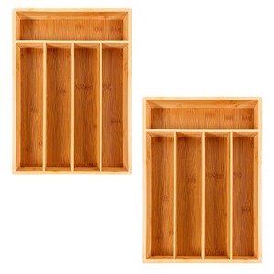 5-Slot Flatware Organizer Features 5 built-in dividers to sort and organize place setting pieces; can be used in the kitchen for fork, spoon, knife, and gadget organization. All the right spaces for flatware in renewable bamboo. Designed to fit almost any kitchen drawer. Eco-friendly, and functional! 14" x 10". Set of 2.