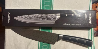 [This review was collected as part of a promotion.] I love this BergHOFF Antigua 8 inch chef knife. It has good weight but not too heavy. The triple riveted handle is comfortable in your hand. The blade is high quality German steel that has a Damascus pattern for such a cool look. This knife is razor sharp and slices through any food with ease. I definitely recommend buying this knife.