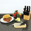 - Stylish wooden knife block. Ergonomically designed handle for a firm and safe grip. Well-balanced with a heavy bolster for increased control.