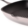 - This grill pan features a helper handle to easily maneuver the pan from stovetop to oven or serving dish and two pour spouts on each side to drain excess liquids or pour out sauces. The square shape provides ample cooking space while its ridged grill lines enhance the presentation of your food and help to drain excess fat, making your meals healthier.
