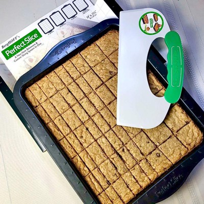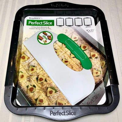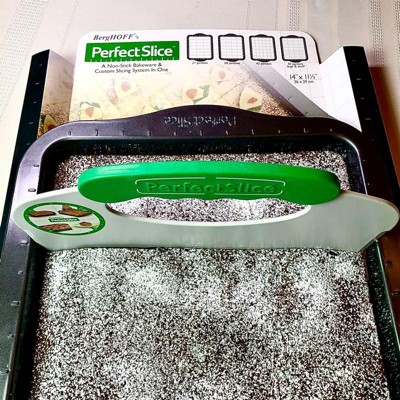 [This review was collected as part of a promotion.] Fantastic bakeware! I absolutely love this Perfect Slice Non-Stick Bakeware and Custom Slicing System by BergHOFF which I received complimentary for product trial. This heavy duty, 14”x 11 1/2” inch baking sheet is large and can easily hold 2 family size boxes of brownie mix, perfect for large get togethers or potlucks. It bakes evenly and releases my baked goods with ease. My brownies and cookie bars slip right out of this pan, without any sticking or breakage which I appreciate. I love the grid markings along the edges of this pan, they truly help guide me into slicing the perfectly sized pieces that I desire. The silicone cutting device is simple to use, it is molded to fit comfortably in my hand, and it cuts clean, straight lines through my baked goods without any force being used or knives needed. I simply line up the cutting device with the grid markings for the size I desire and press into the baked goods, the cutting device edge does all the work for me resulting in perfectly cut squares or rectangles. Such an easy pan for me to use, the handle grips are generous in size making it easy to maneuver in and out of the oven and the nonstick finish is easy to clean which does save me time. I expect that this durable, high quality pan will provide many years of service and I consider this to be an excellent value. BergHOFF Perfect Slice Baking Sheet is perfect for cookies, cookie bars, brownies, or any dessert bar and I recommend it to anyone that does baking.