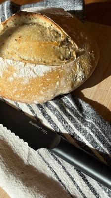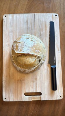 [This review was collected as part of a promotion.] This bread knife delivers clean, effortless slices every time. The long, serrated blade glides through artisan sourdough loaf i bake occasionally without tearing or crushing. It feels well balanced in hand, offering excellent control and stability during use. Has a solid build with a sharp edge that stays consistent from heel to tip. Like the black color of the handle and the blade. Easy to clean. I tried cutting veggies and fruit with the knife as well and it is reliable. Overall a great addition to my kitchen utensils.