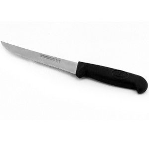 8" Scalloped Utility Slicer is made from high quality, ice hardened stainless steel, these knives feature ergonomically designed black, soft grip, thermo plastic handles. Easily sharpened and holds their edge well. The handle is safe, high impact, slip resistant as well as antimicrobial and micro-organism safe. The knife is and low temperature resistant and safe to use in the freezer.