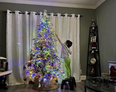 Transform your holiday decor with our Pre-Lit Flocked Aspen Noble Fir Christmas Tree. Crafted with specially designed branches that blend premium-quality PE and PVC, this tree authentically captures the stiff, horizontal pattern of the iconic Noble Fir. With a strong foundation of realistic, flame-retardant branch tips, it can effortlessly support your heaviest ornaments. The sturdy metal base keeps your tree upright throughout the holiday season. Assembly is a breeze with a simple 3-step process, complemented by the instant cordless light system. Stack the tree sections, fluff the branches, and plug in the base for a brilliant display. Thousands of tips create a lush, full appearance that leaves plenty of room for your decorating creativity. And with nine versatile light functions featuring warm white and multicolored LED lights, you can add a dynamic touch to your holiday celebrations.