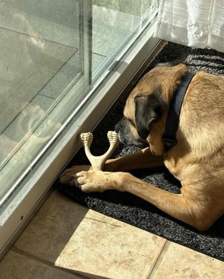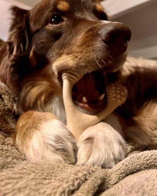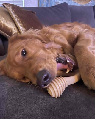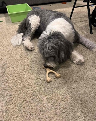 [This review was collected as part of a promotion.] Our 55lb 1.5 year old Labradoodle LOVES this chew. This is a great chew to keep her busy and stimulated. The design of the chew being a wishbone is great because she can use her paws to hold down the 2 sides as she chews on the other. She is very proud of her chew and brings it everywhere with her, granted it’s been 2 days but it hasn’t left her side in the 2 days we’ve had it. This chew is very very hard so if you have a dog that picks up and drops things a lot on purpose that’s something to be mindful of. I received an incentive to write this review.