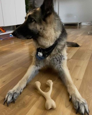 [This review was collected as part of a promotion.] I've been on the hunt for a new bone for my 2 year old GSD. As soon as I opened the package, my dog was excited and wagging her tail. She immediately started chewing on it and seems to really enjoy it. The material doesn't appear cheap or or crumble like other plastic-type bones. I love that there are different textures on it to aid in keeping her teeth clean as well! This will definitely keep my dog happy and busy for a long time! I received an incentive to write this review.