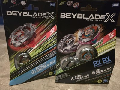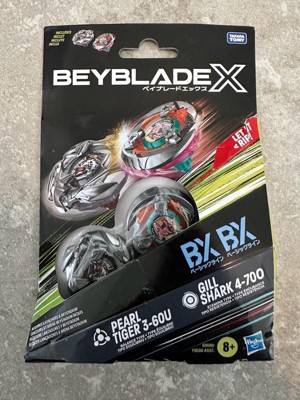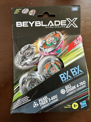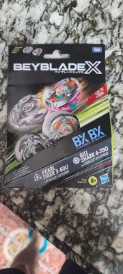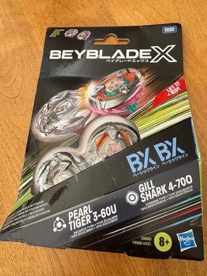 - INTERCHANGEABLE DIE-CAST BLADES: Includes Takara Tomy-designed Beyblade X top with authentic die-cast metal parts: Gill Shark 4-70O BX Right-Spin Stamina Type and Pearl Tiger 3-60U BX Right-Spin Balance Type